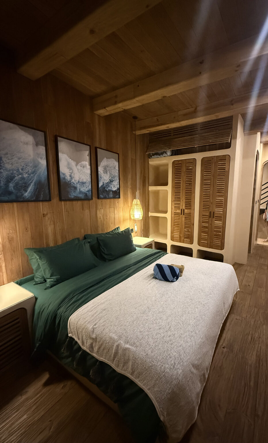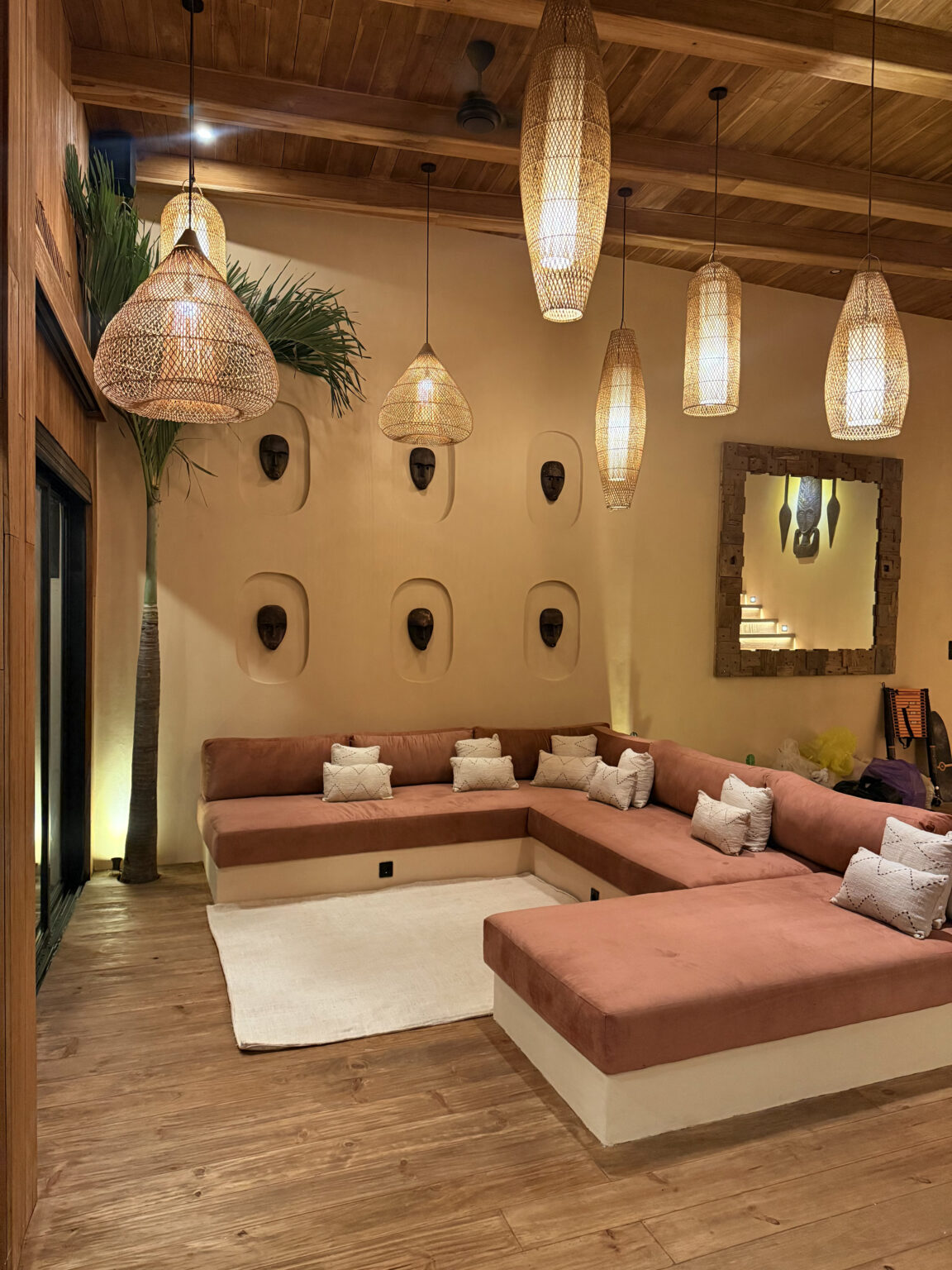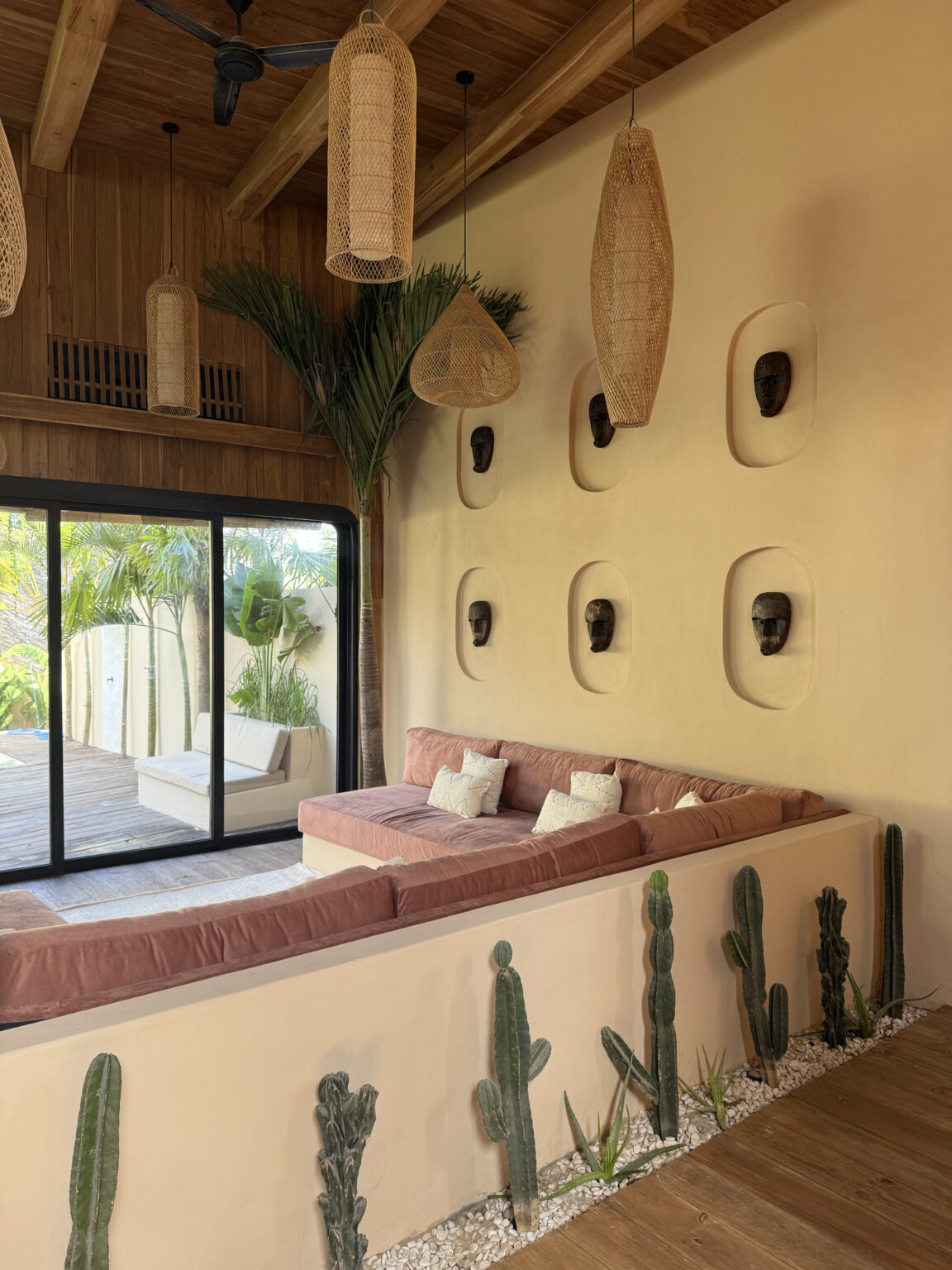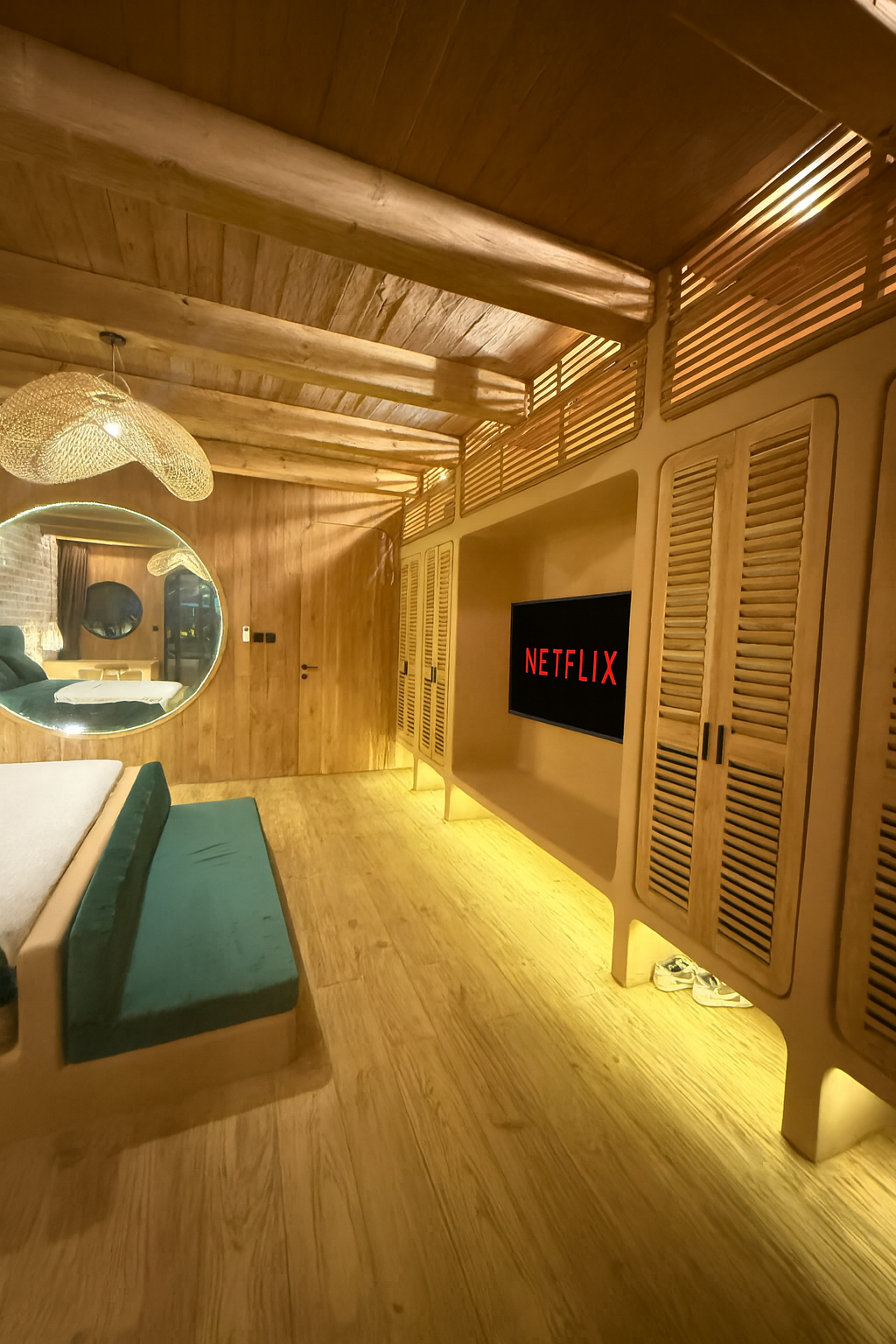 The air-conditioned living room features a spacious built-in sofa, soft cushions, and handcrafted décor—perfect for relaxing after a day under the Bali sun. Subtle lighting, wooden accents, and artistic wall details give the space a calming, boutique-style feel.
