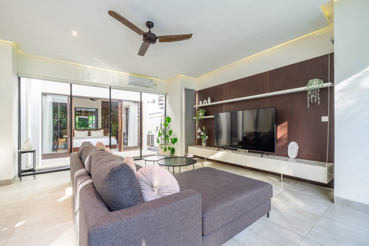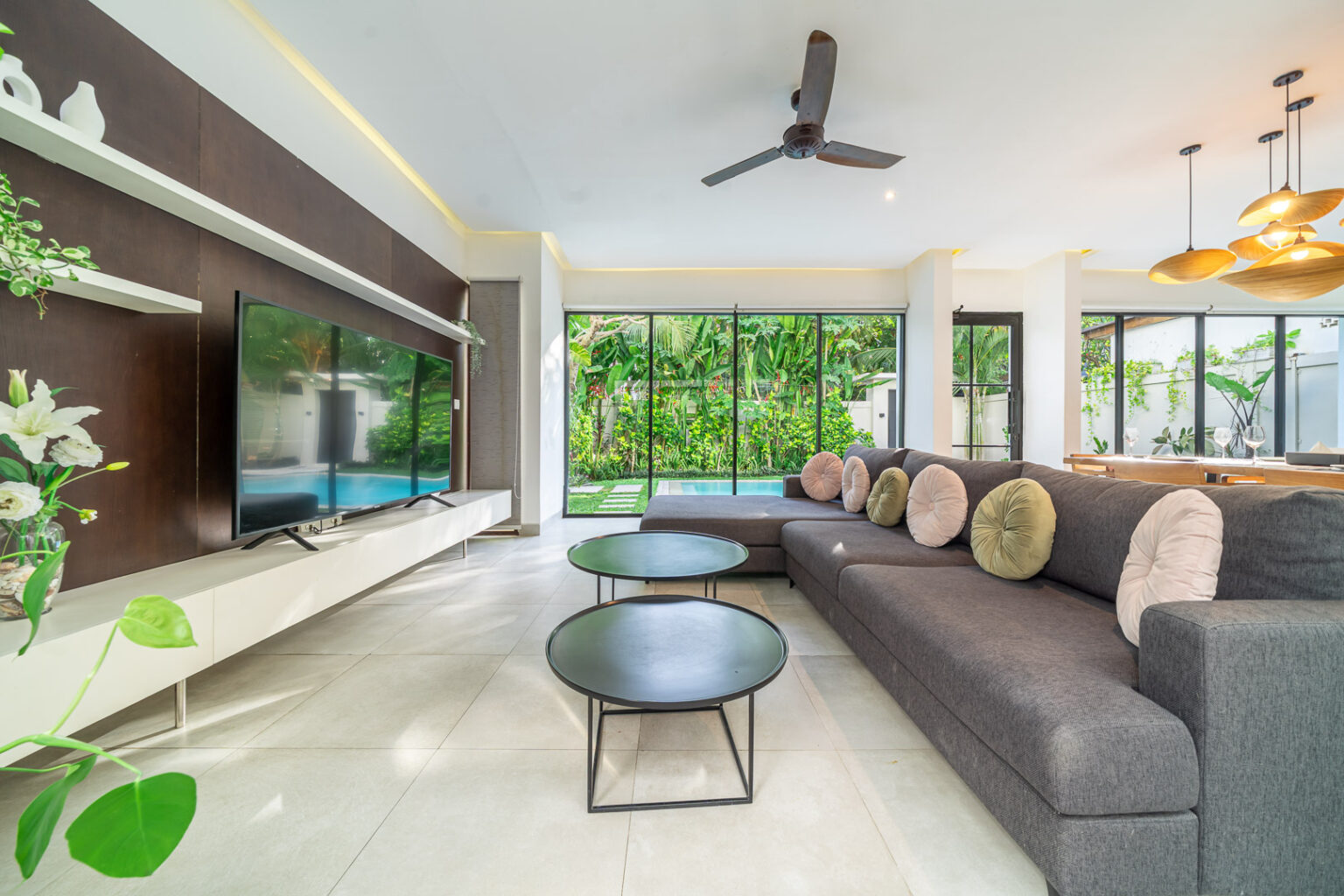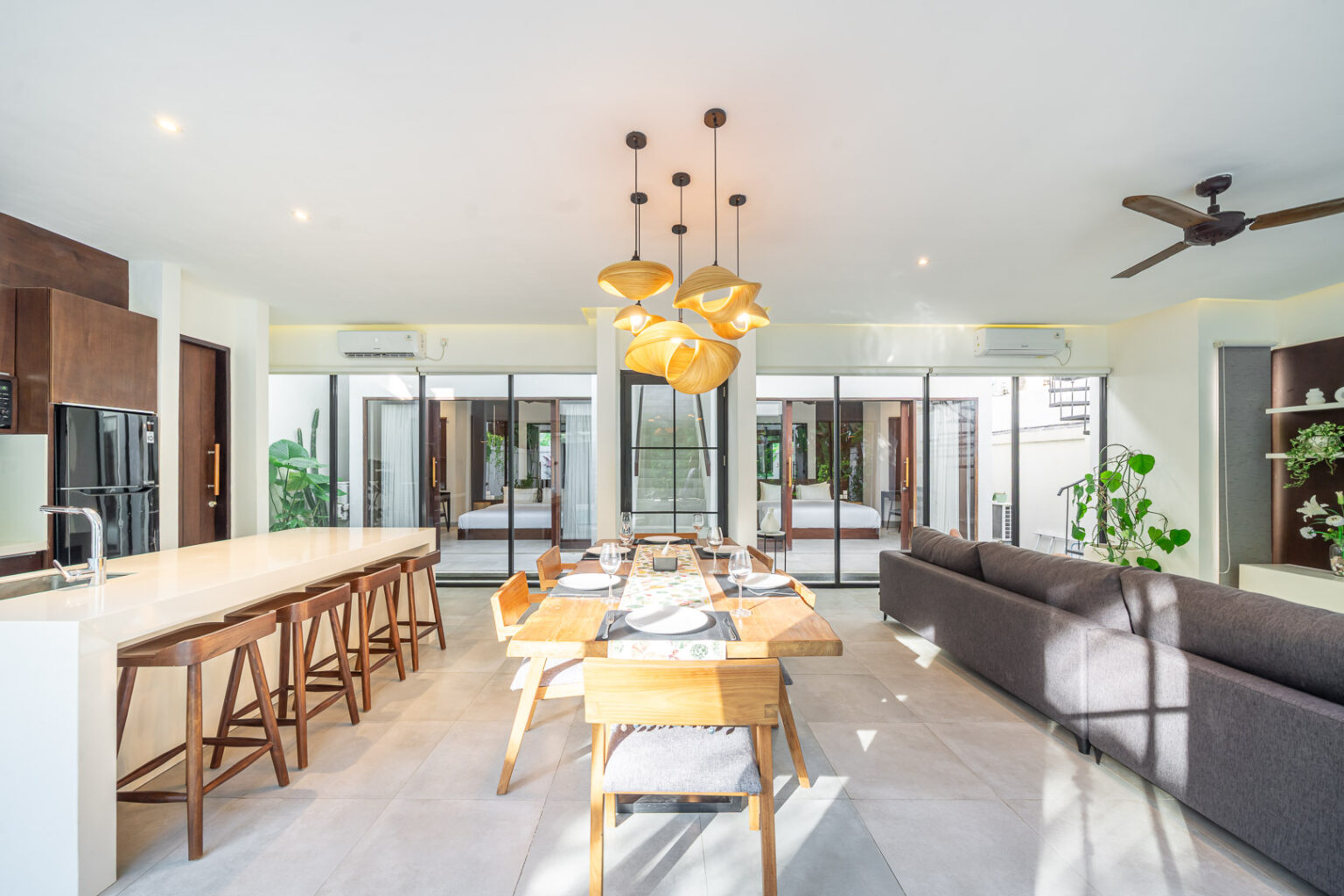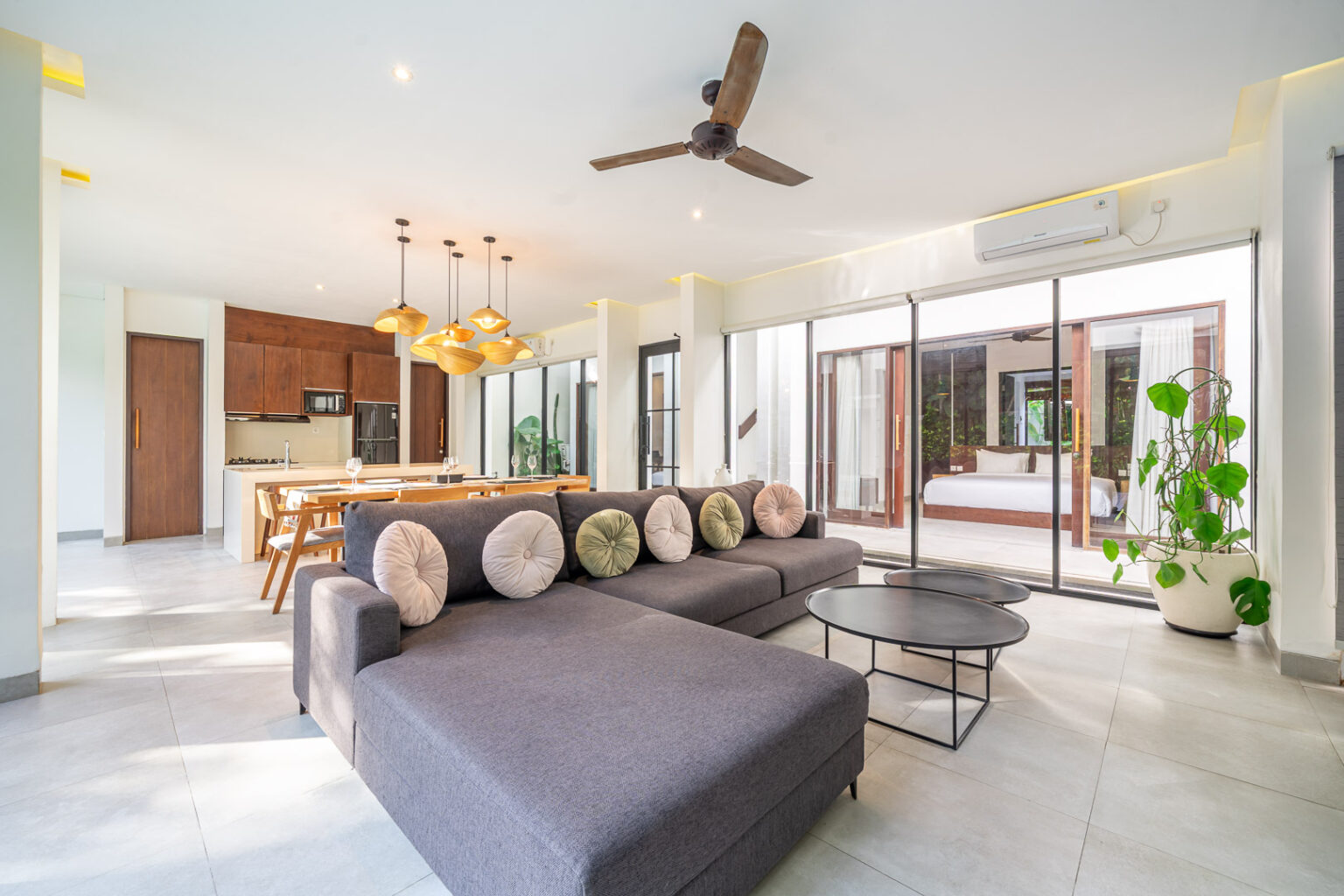 The air-conditioned living area features a central glass door that opens to the pool, allowing natural light to brighten the space while maintaining a cozy and cool atmosphere inside. Each of the three bedrooms includes an ensuite bathroom and calming contemporary décor, providing a comfortable space to unwind after a day out exploring.