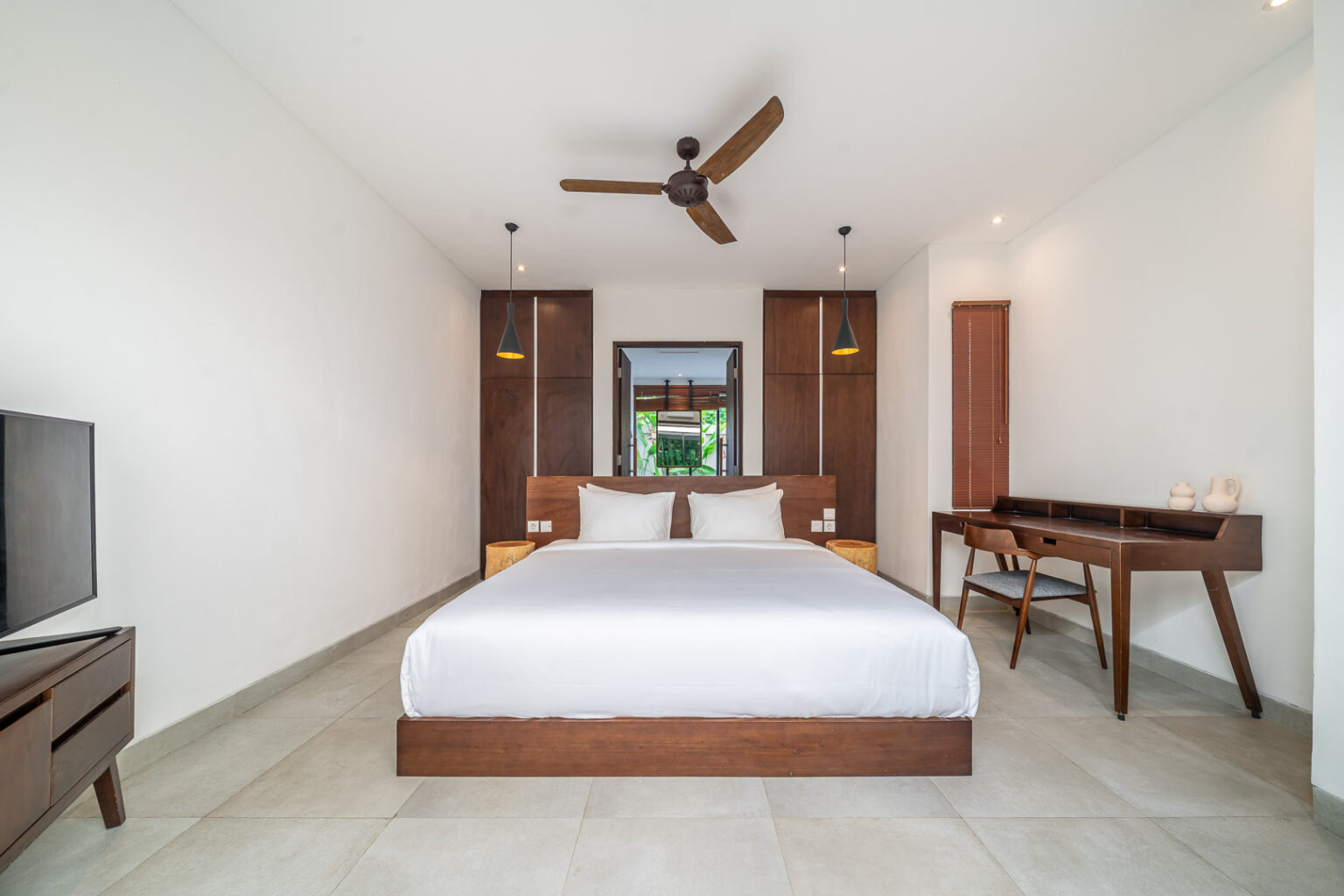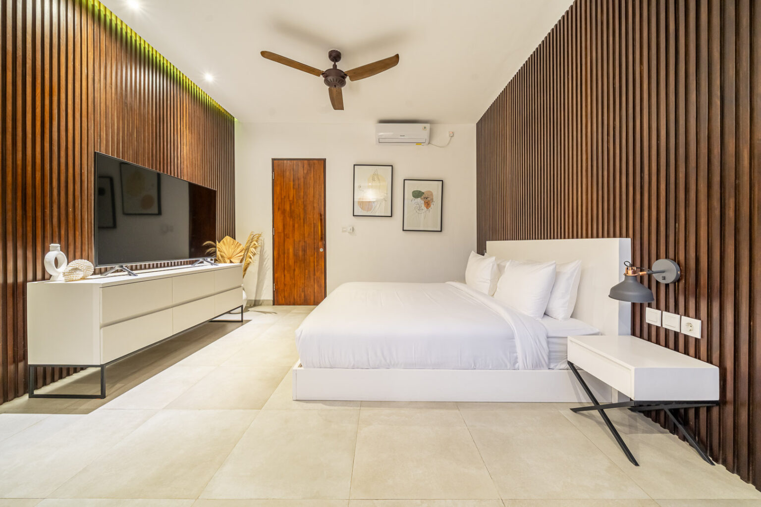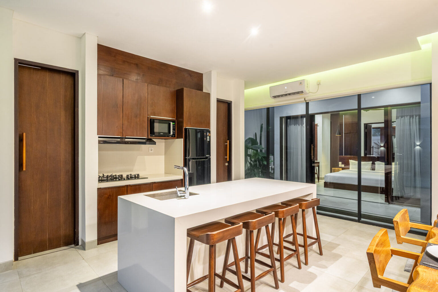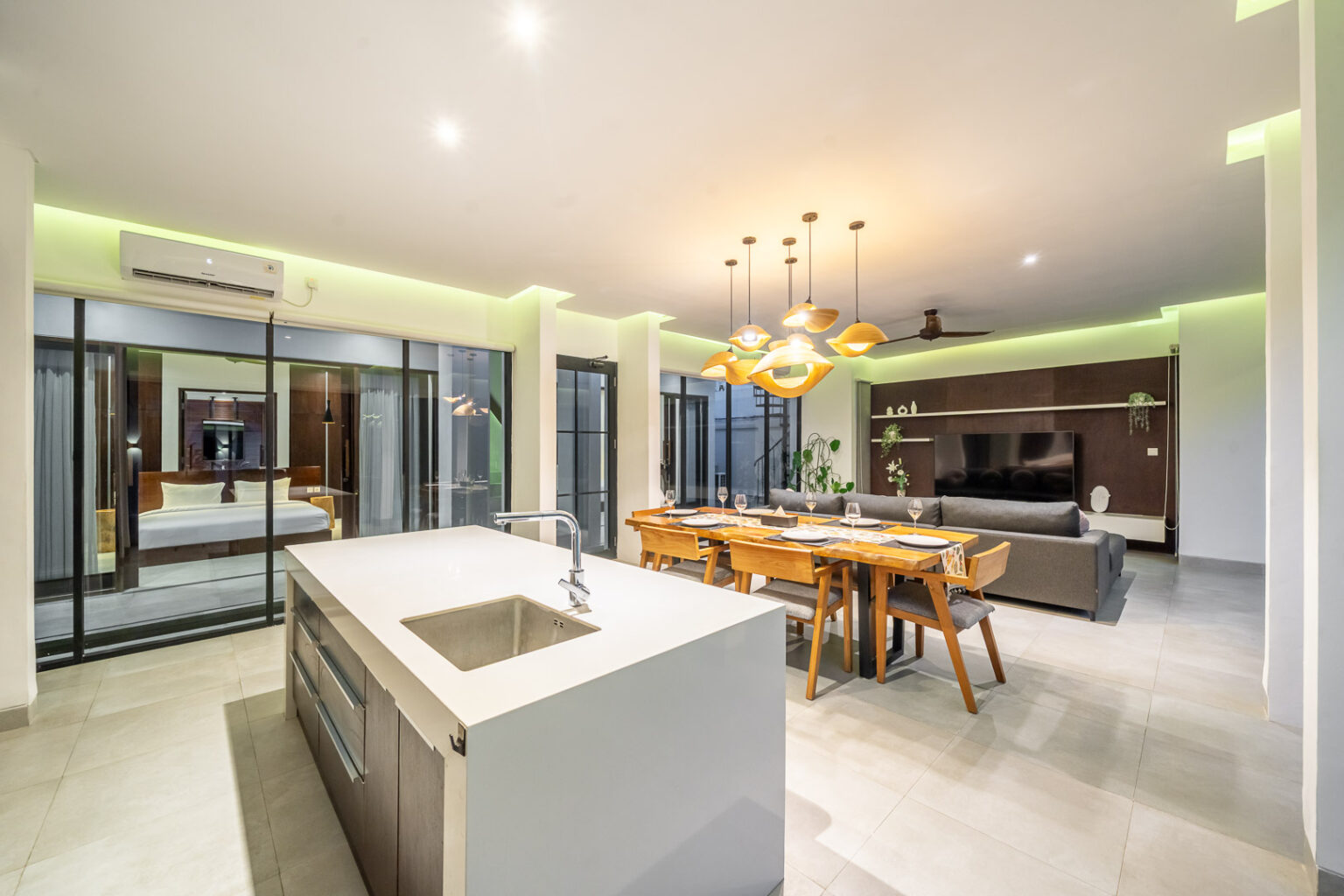The air-conditioned living area features a central glass door that opens to the pool, allowing natural light to brighten the space while maintaining a cozy and cool atmosphere inside. Each of the three bedrooms includes an ensuite bathroom and calming contemporary décor, providing a comfortable space to unwind after a day out exploring.