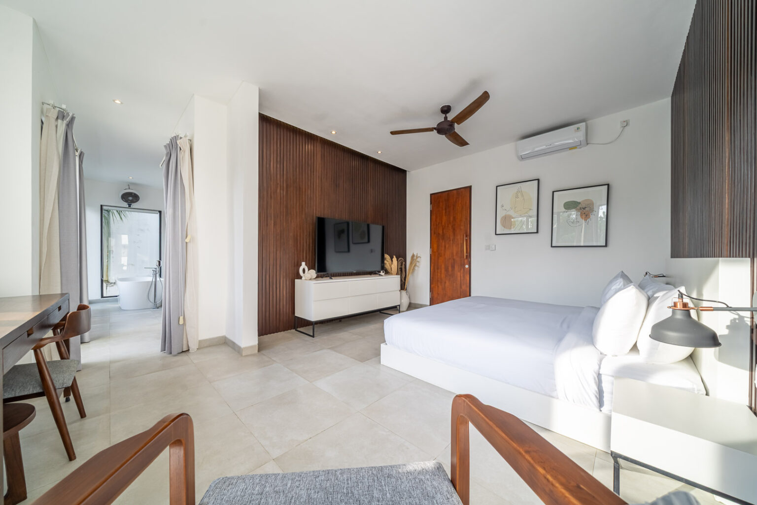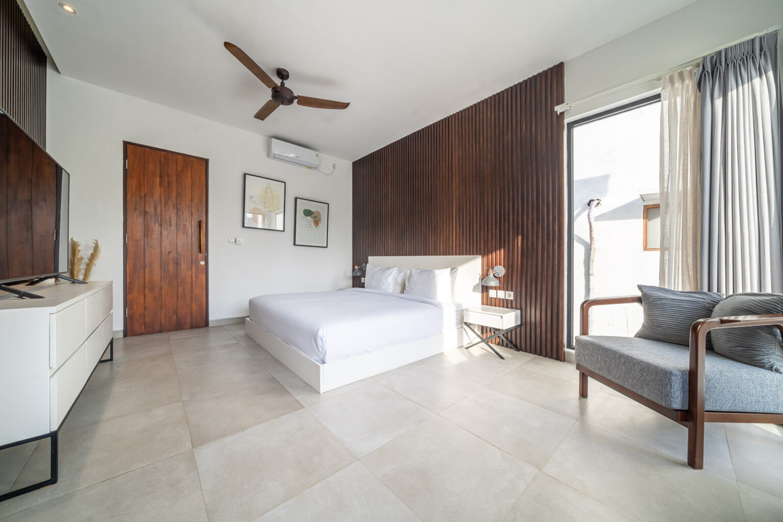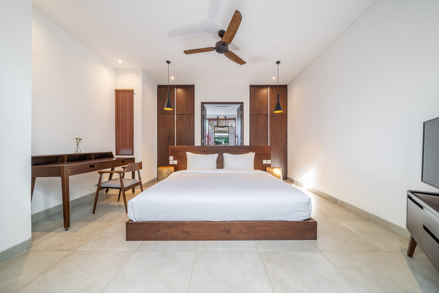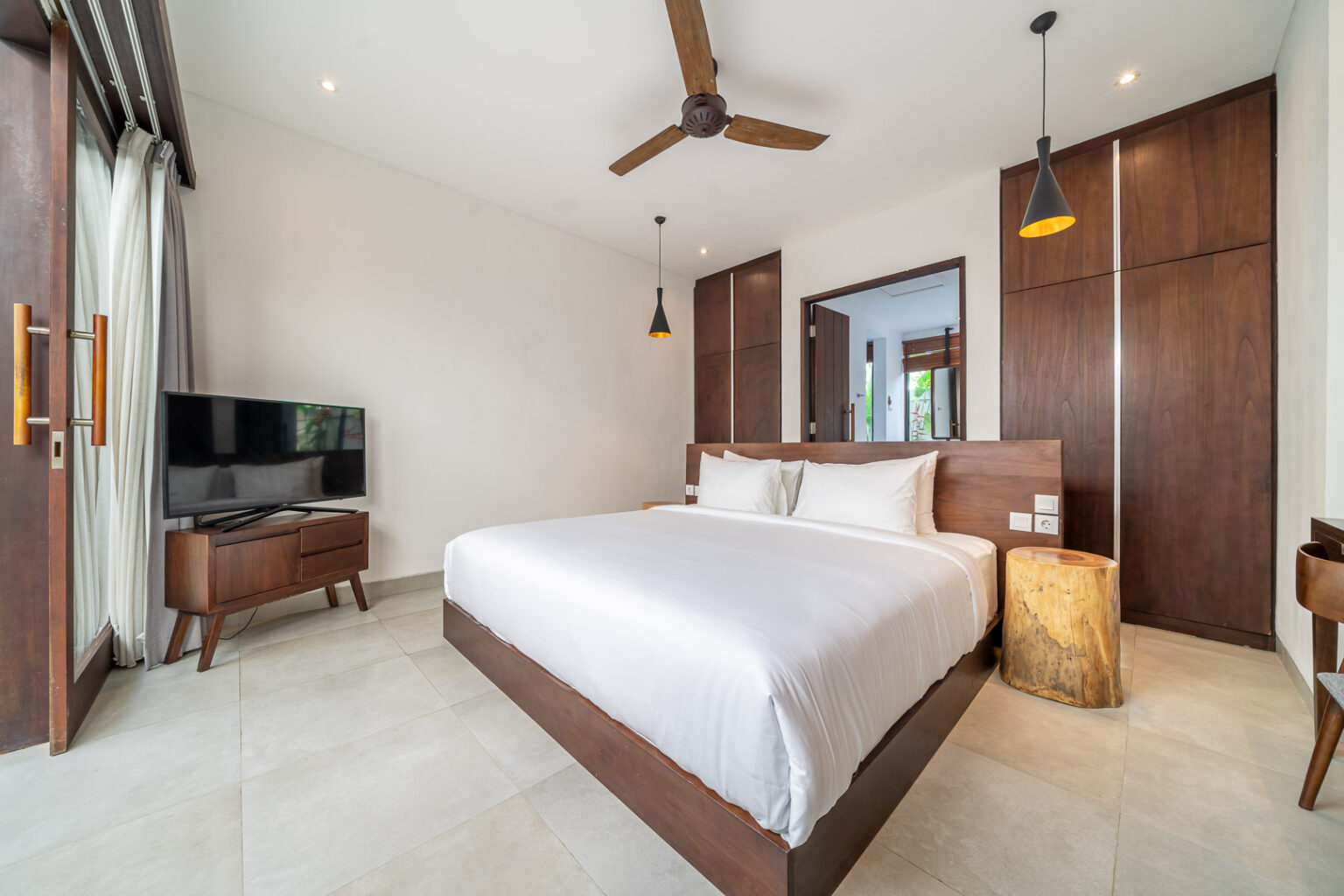 The air-conditioned living area features a central glass door that opens to the pool, allowing natural light to brighten the space while maintaining a cozy and cool atmosphere inside. Each of the three bedrooms includes an ensuite bathroom and calming contemporary décor, providing a comfortable space to unwind after a day out exploring.