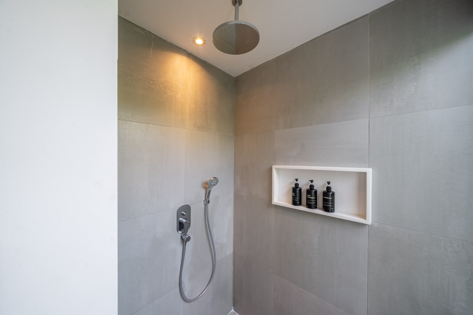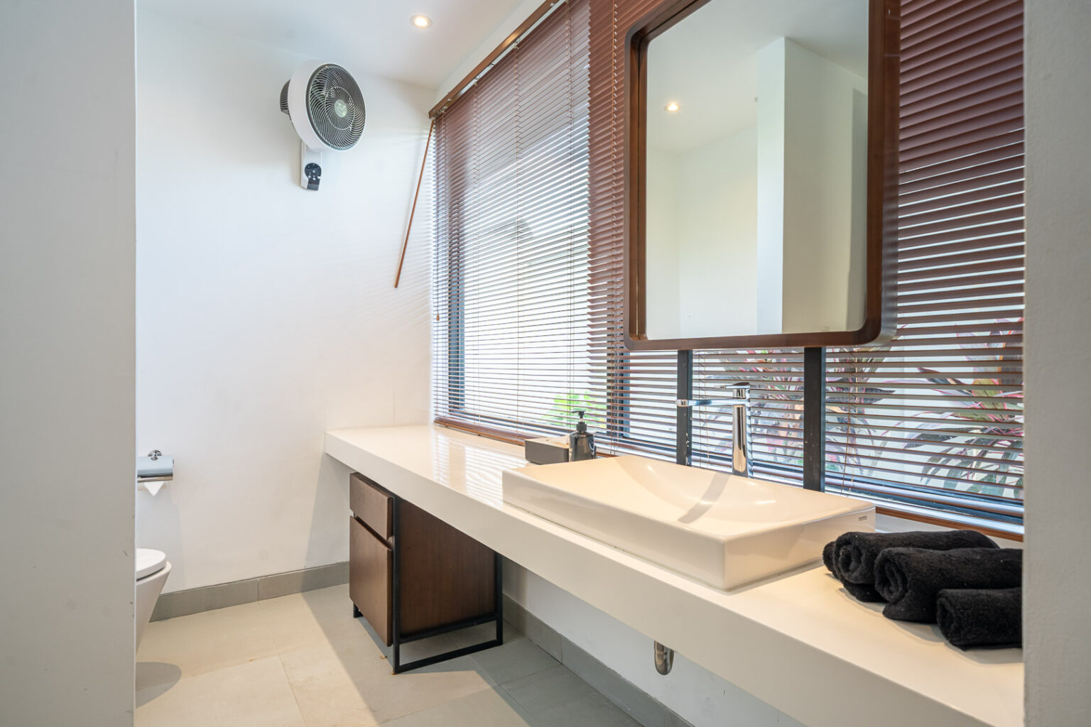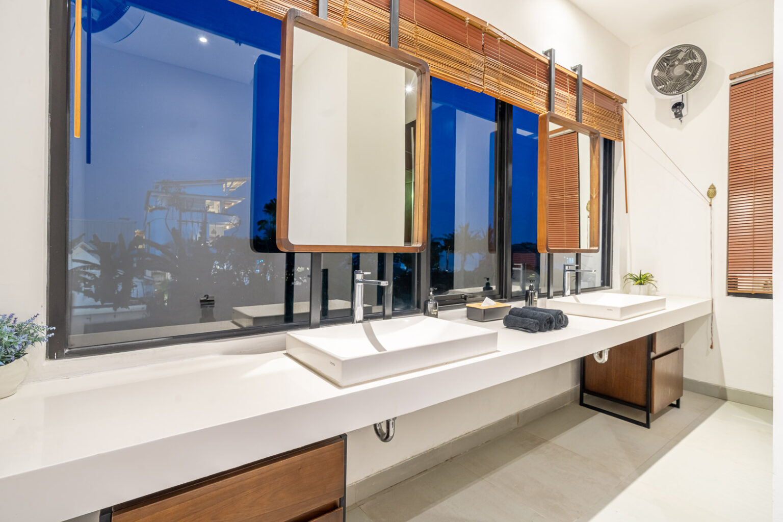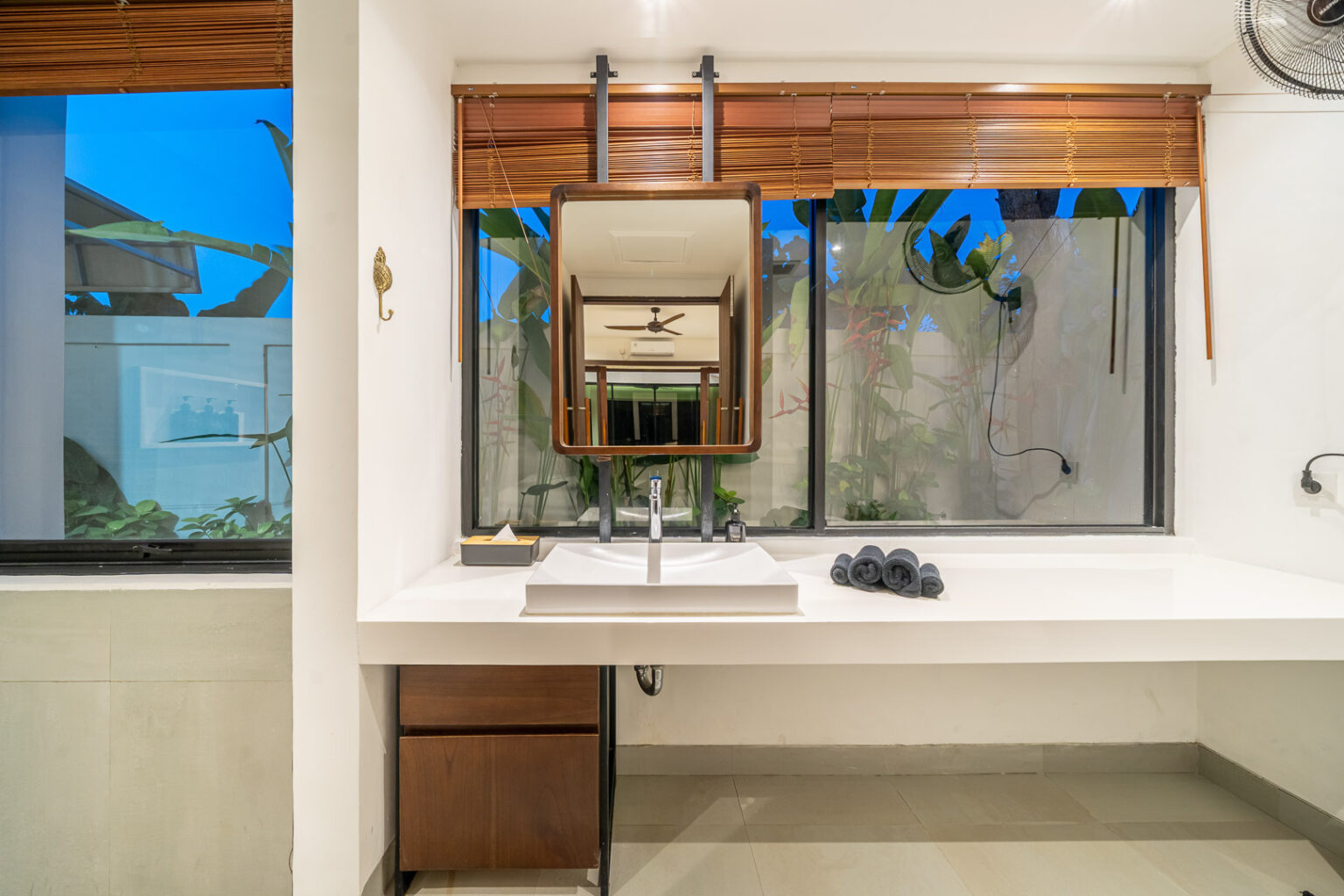 The air-conditioned living area features a central glass door that opens to the pool, allowing natural light to brighten the space while maintaining a cozy and cool atmosphere inside. Each of the three bedrooms includes an ensuite bathroom and calming contemporary décor, providing a comfortable space to unwind after a day out exploring.