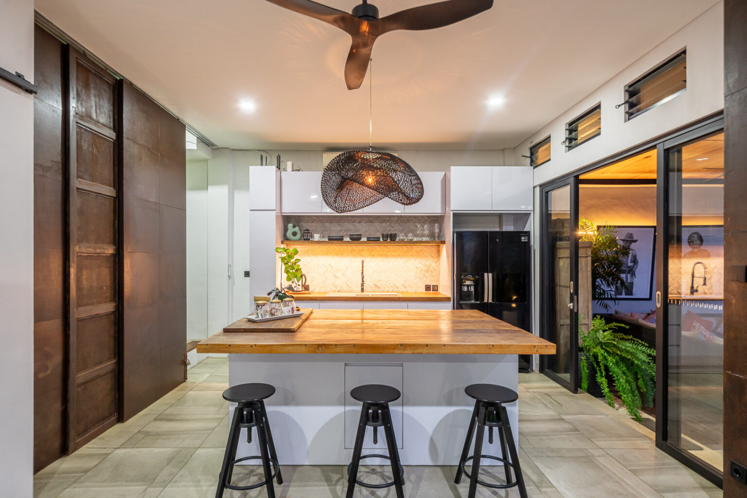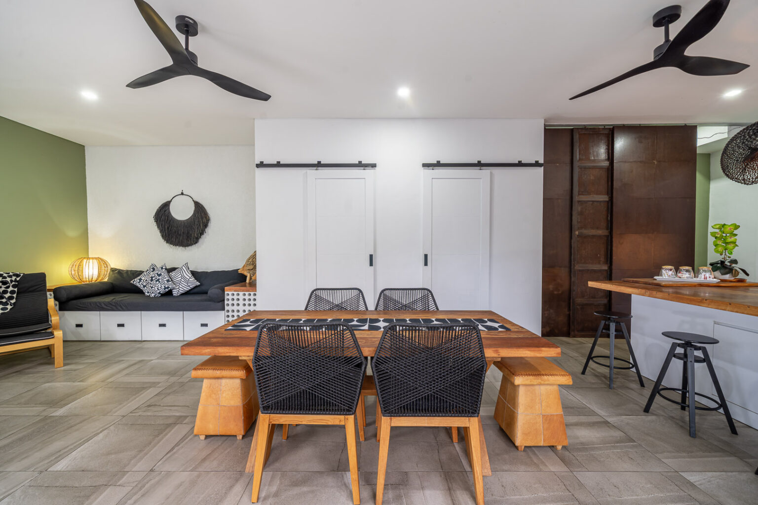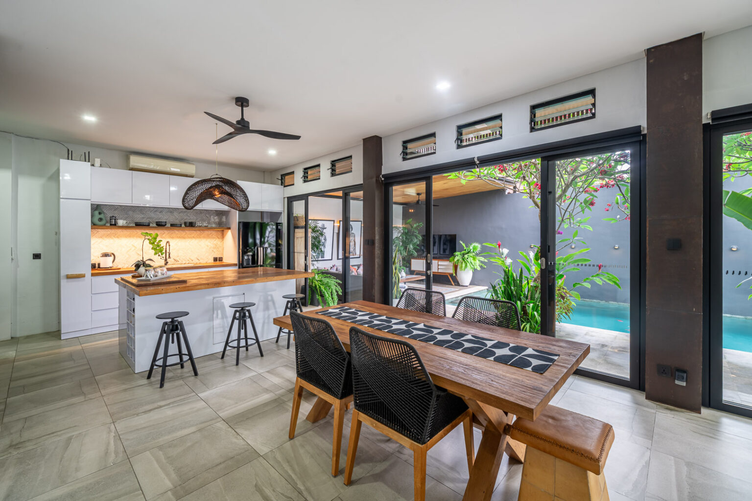 The open living area lets you enjoy the island breeze with ceiling fans, while the air-conditioned dining and kitchen area provides a cool and relaxing space to share meals together. Step outside to your private pool, surrounded by lush plants and the gentle beauty of frangipani trees — an inviting space to unwind and reconnect.