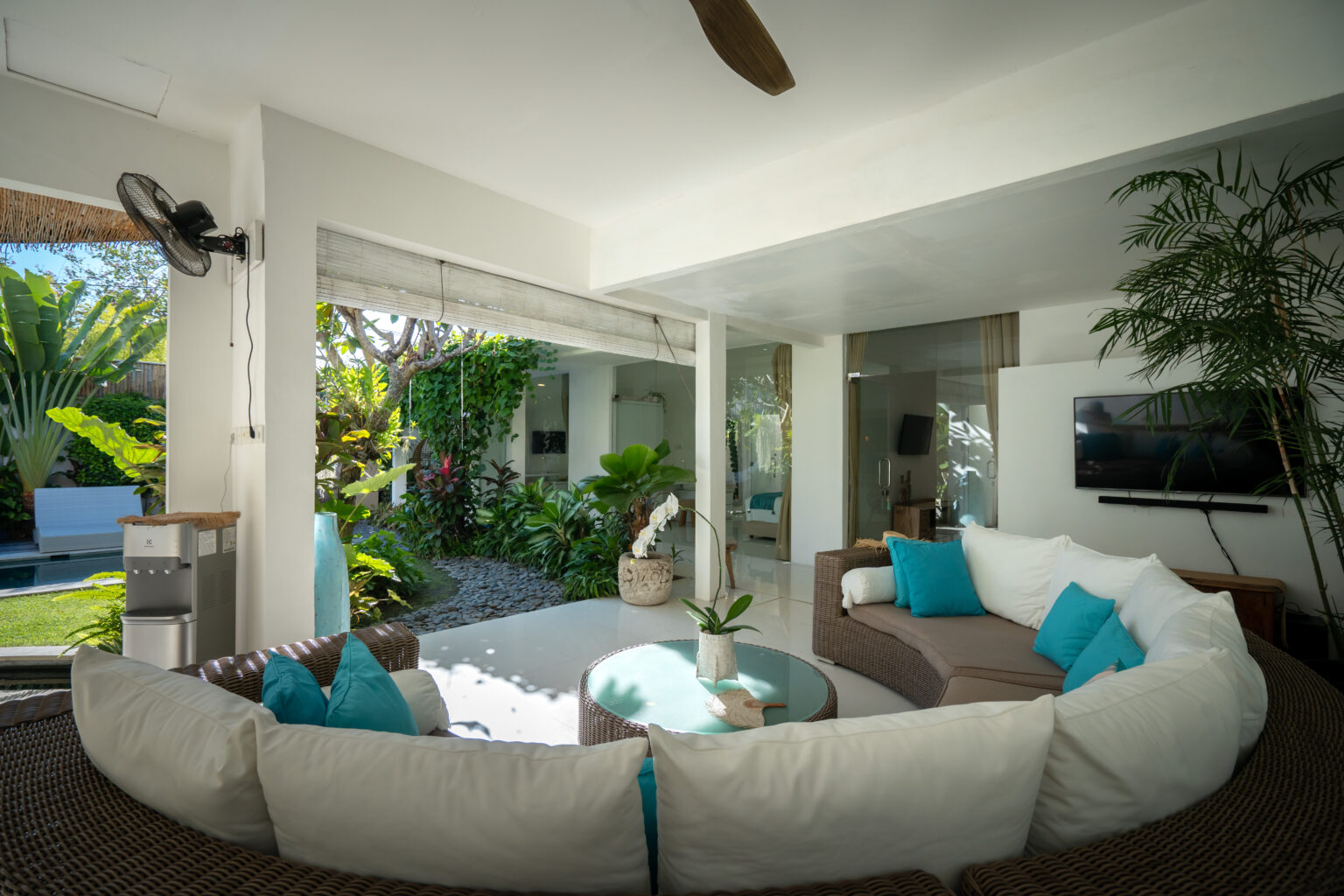 The spacious living area features a relaxed open layout cooled by a ceiling fan, creating a natural flow between indoor and outdoor spaces. Each bedroom is air-conditioned and designed for restful comfort, featuring soft tones, warm lighting, and a calm tropical ambiance.