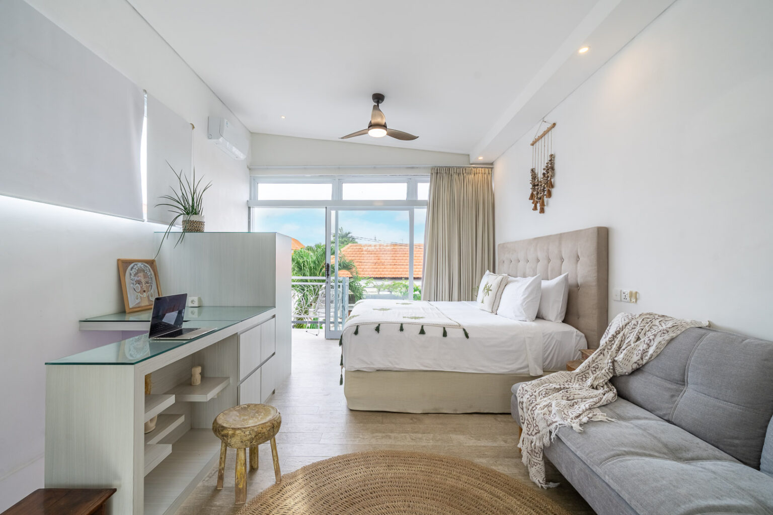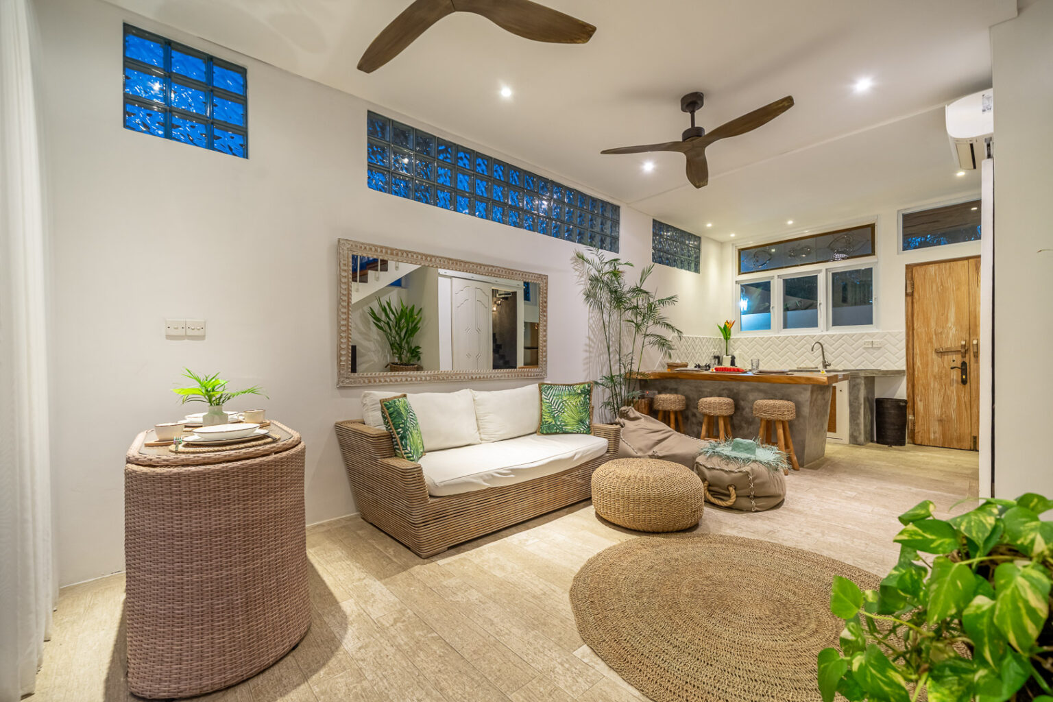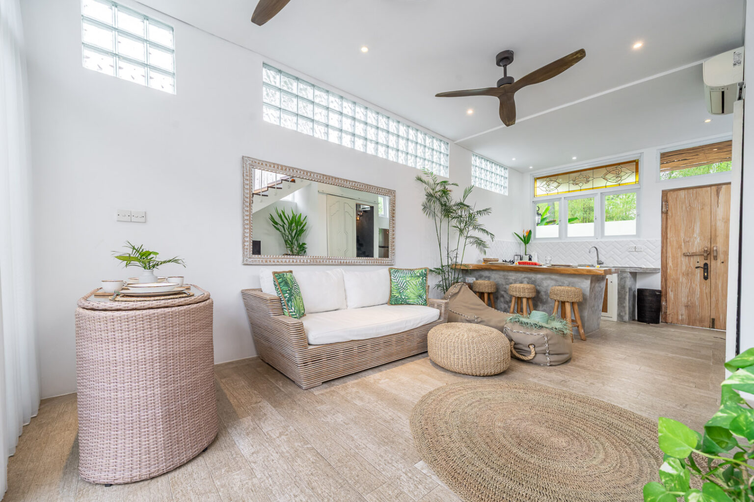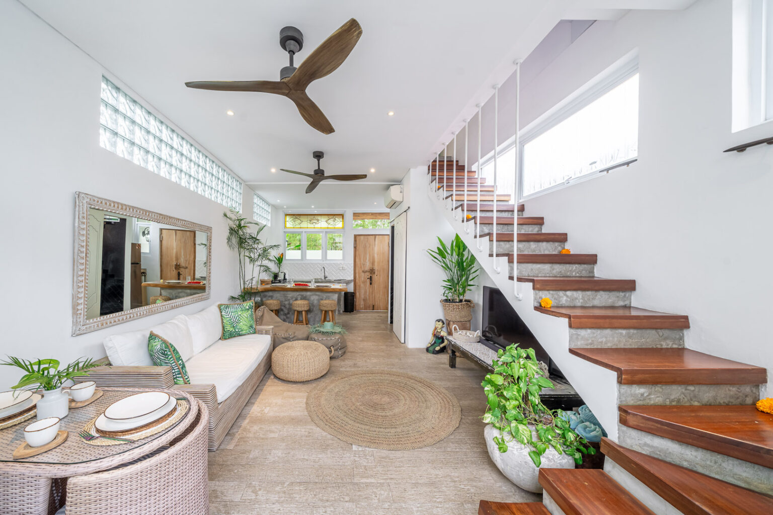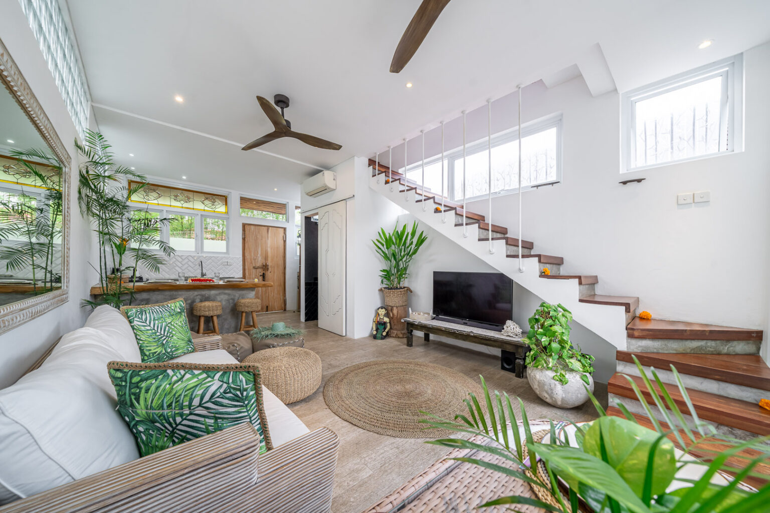 Inside, the enclosed living area is fully air-conditioned, offering a cool and cozy retreat from the Bali sun. Thoughtfully decorated with natural textures, rattan details, and calming tones, it’s the perfect space to unwind or enjoy a quiet evening in. The upstairs bedroom is bright and comfortable, opening to a small balcony with leafy views — ideal for a peaceful morning coffee or an afternoon break.