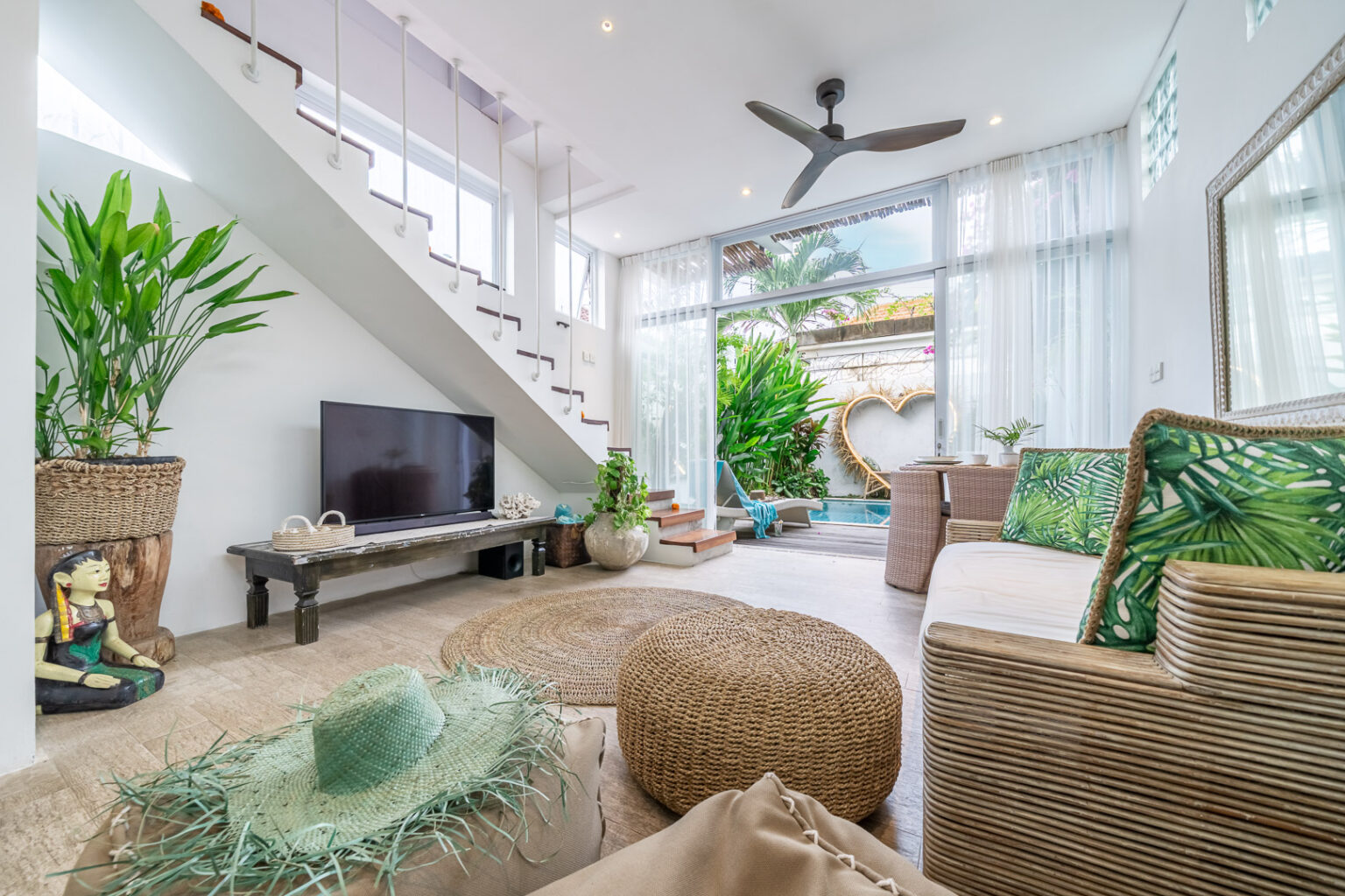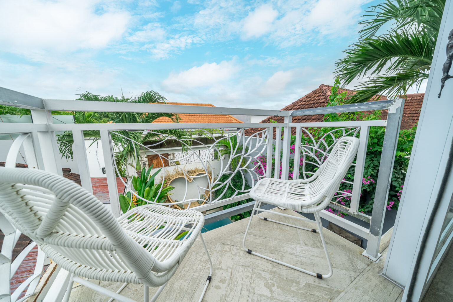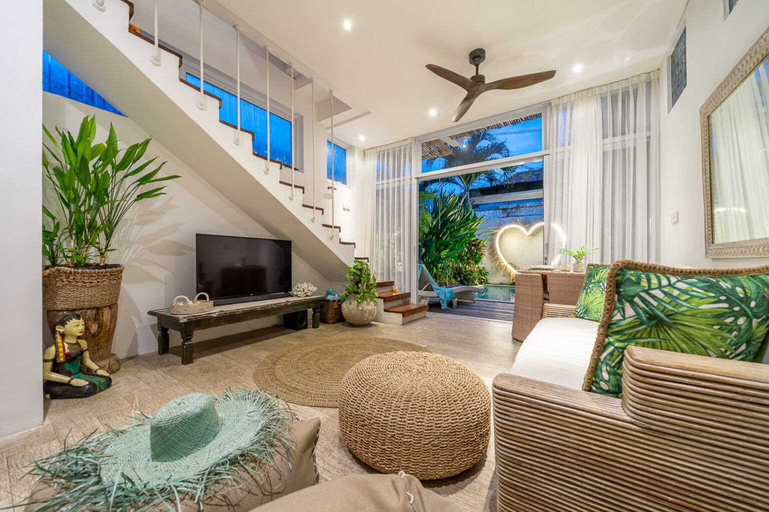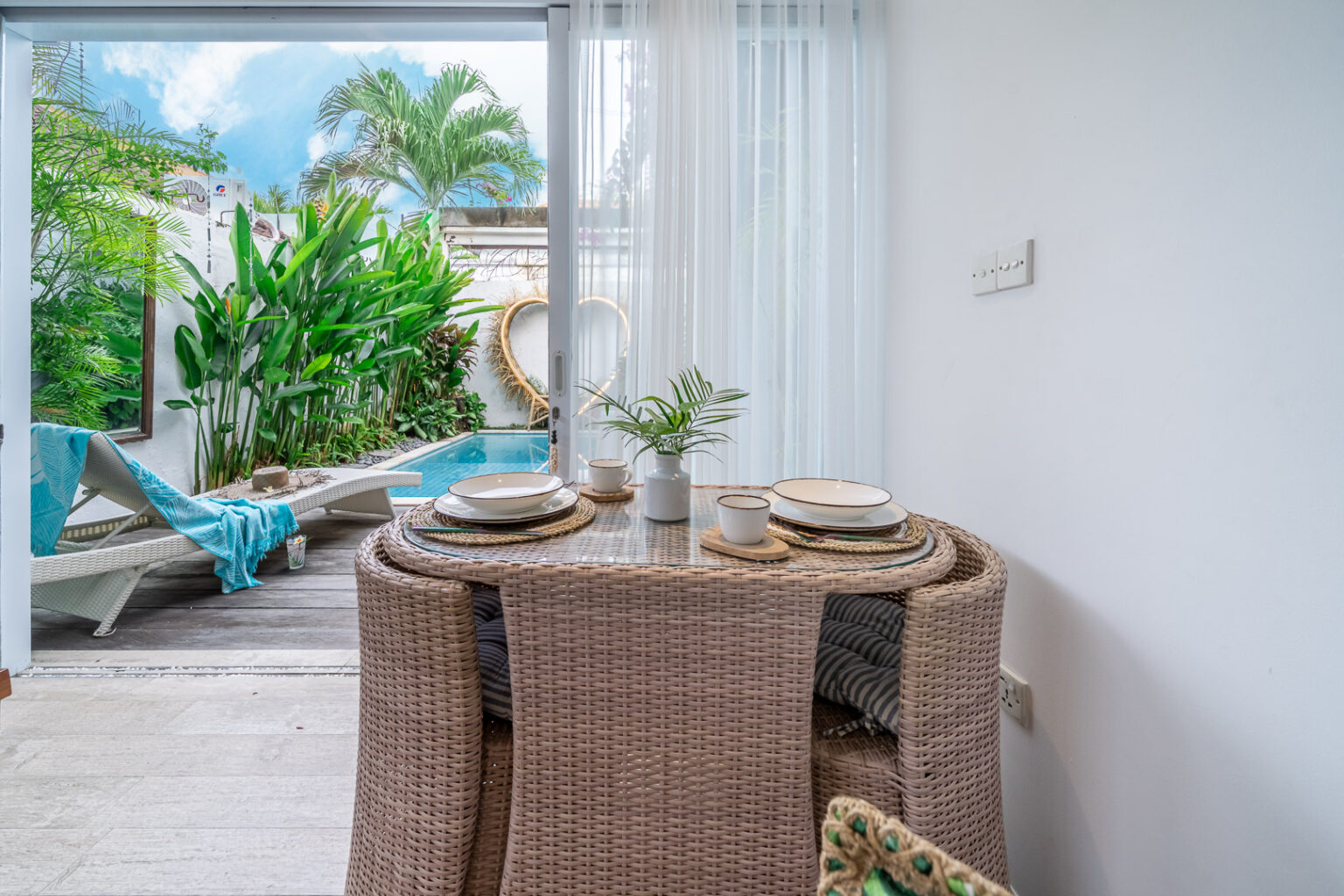 Inside, the enclosed living area is fully air-conditioned, offering a cool and cozy retreat from the Bali sun. Thoughtfully decorated with natural textures, rattan details, and calming tones, it’s the perfect space to unwind or enjoy a quiet evening in. The upstairs bedroom is bright and comfortable, opening to a small balcony with leafy views — ideal for a peaceful morning coffee or an afternoon break.