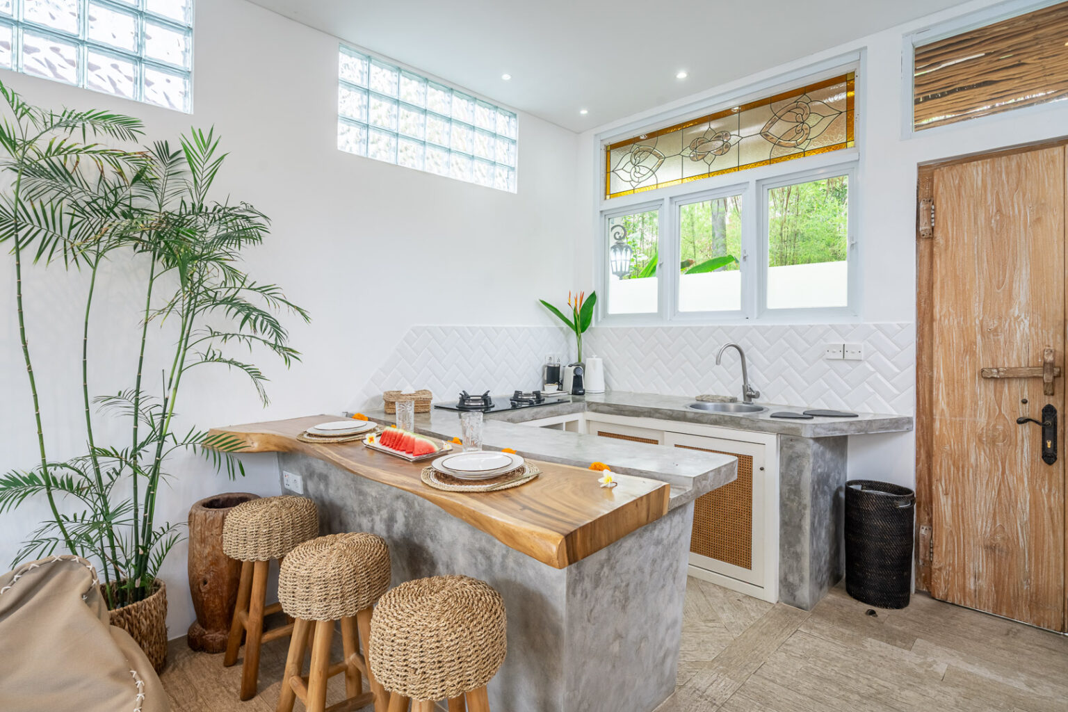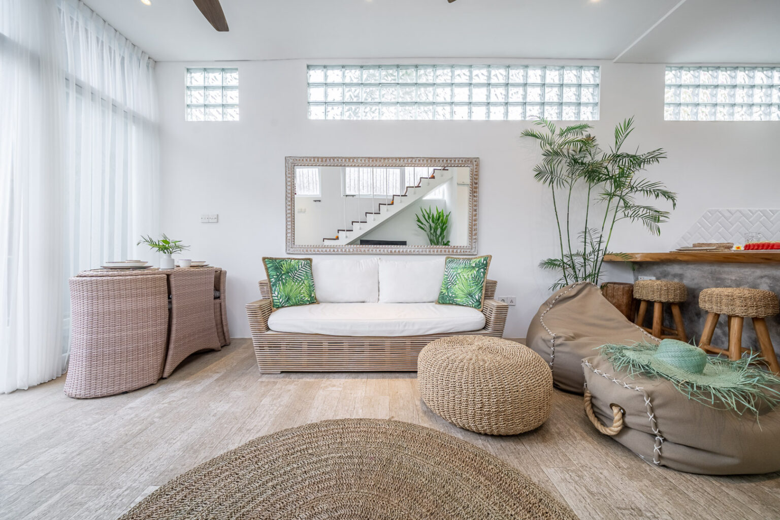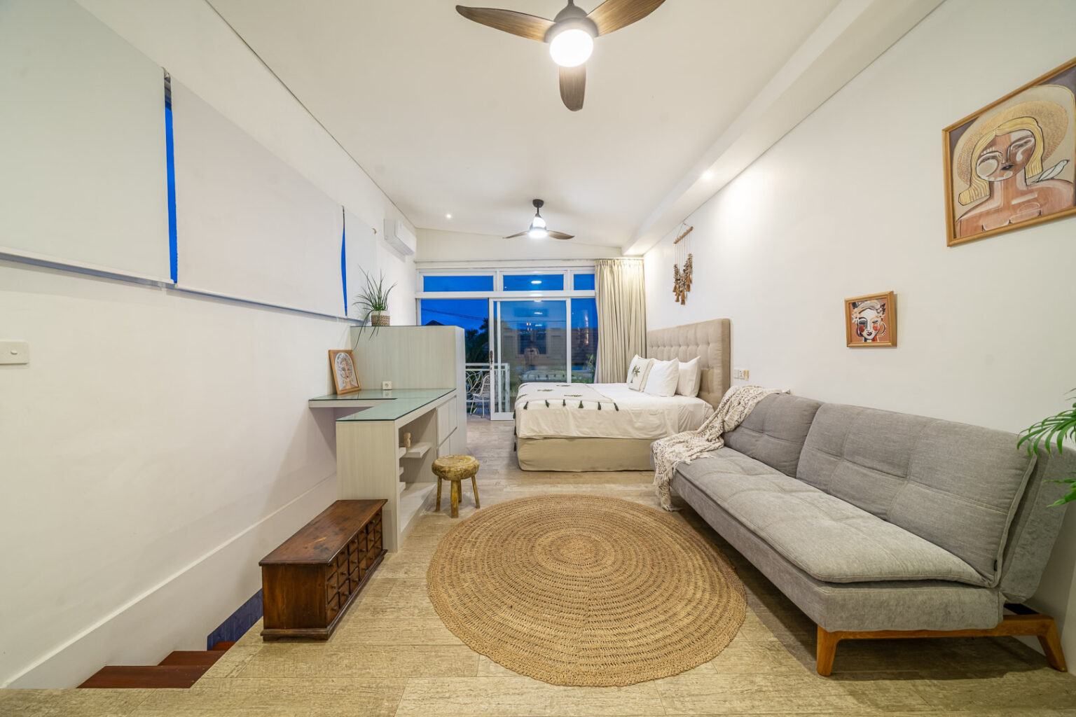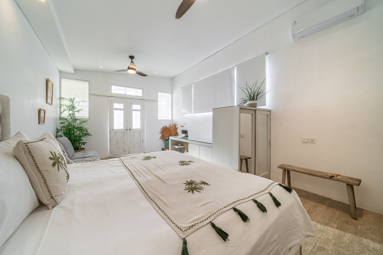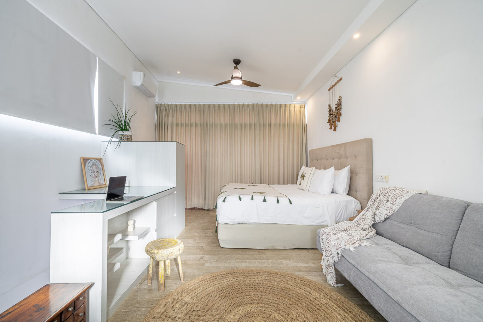 Inside, the enclosed living area is fully air-conditioned, offering a cool and cozy retreat from the Bali sun. Thoughtfully decorated with natural textures, rattan details, and calming tones, it’s the perfect space to unwind or enjoy a quiet evening in. The upstairs bedroom is bright and comfortable, opening to a small balcony with leafy views — ideal for a peaceful morning coffee or an afternoon break.