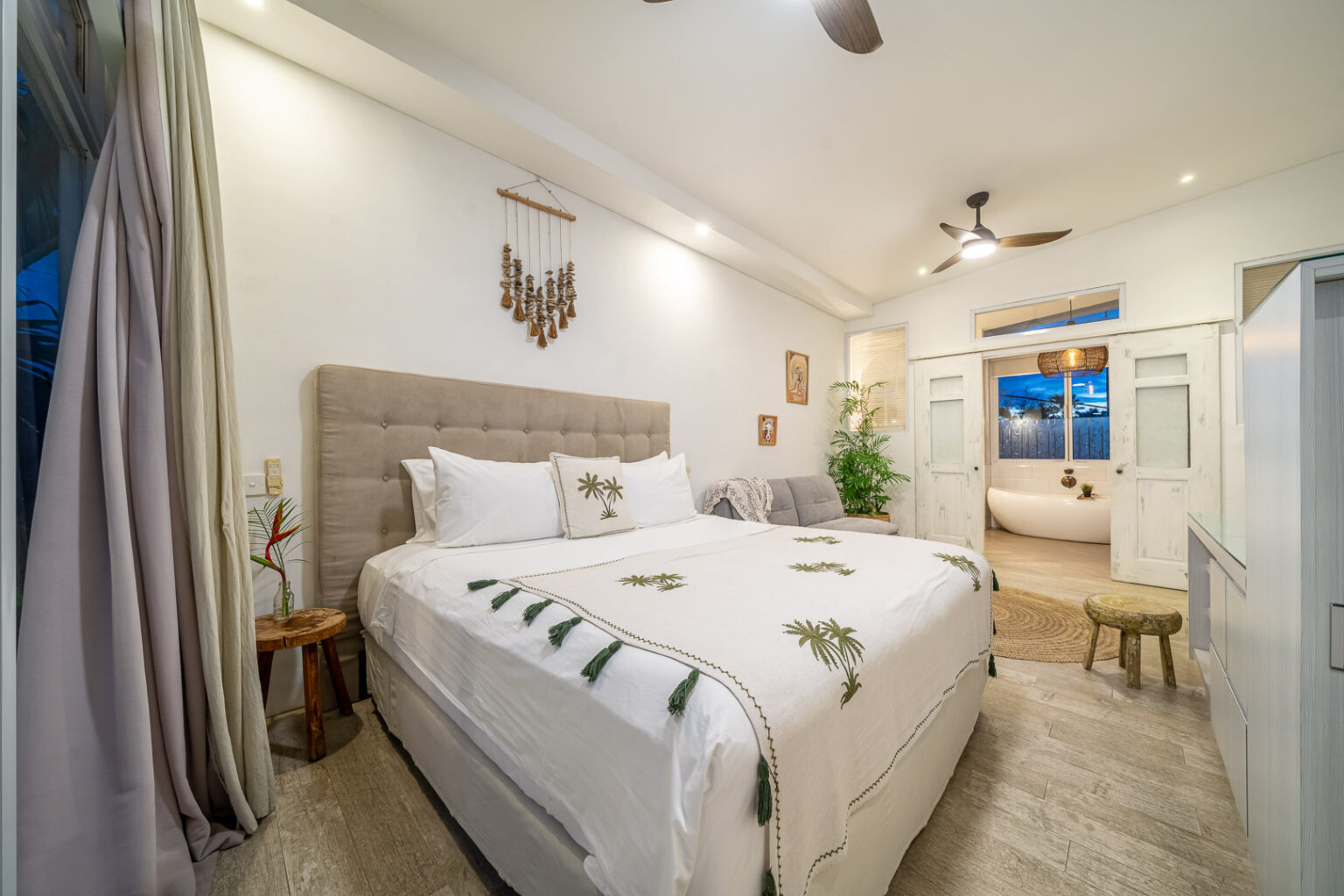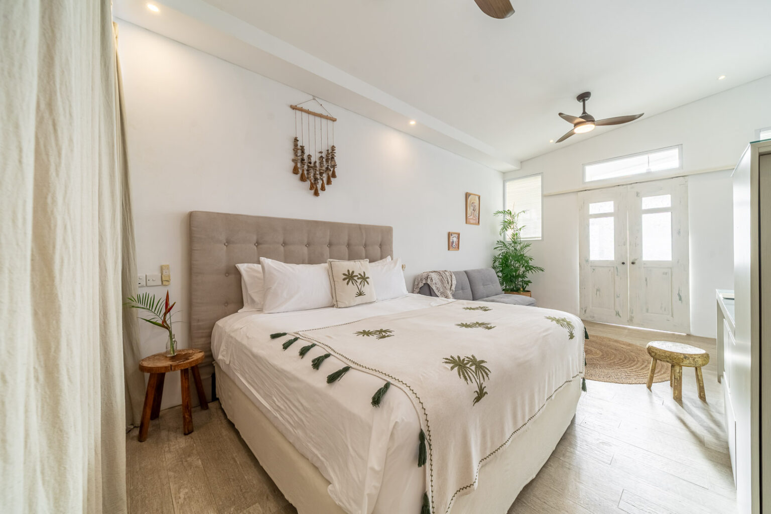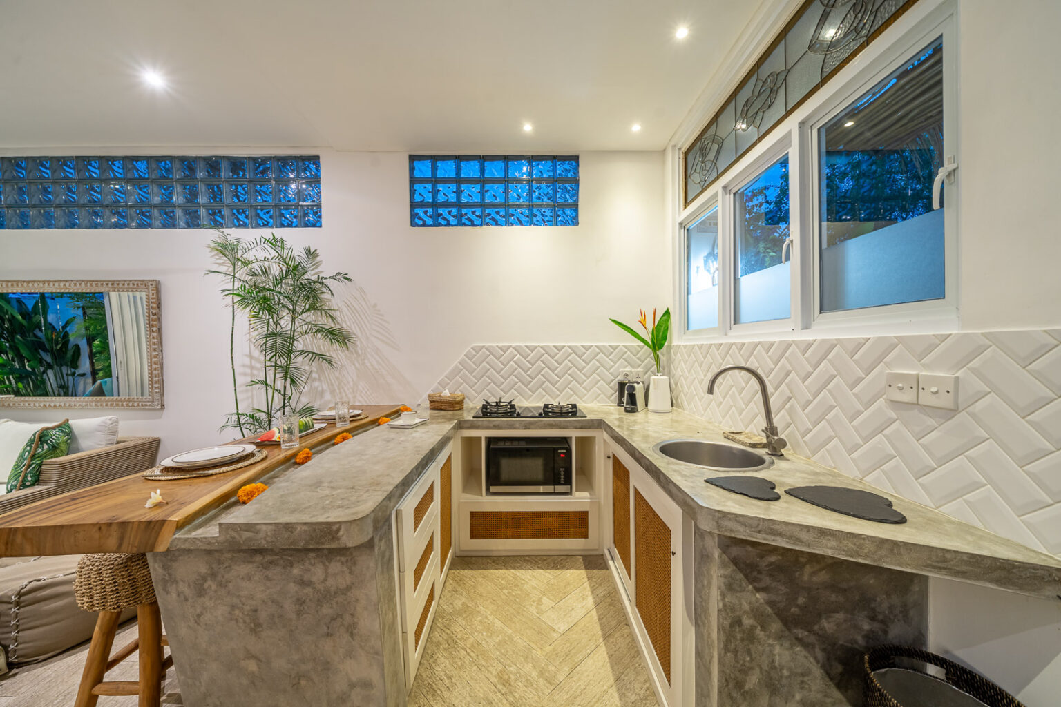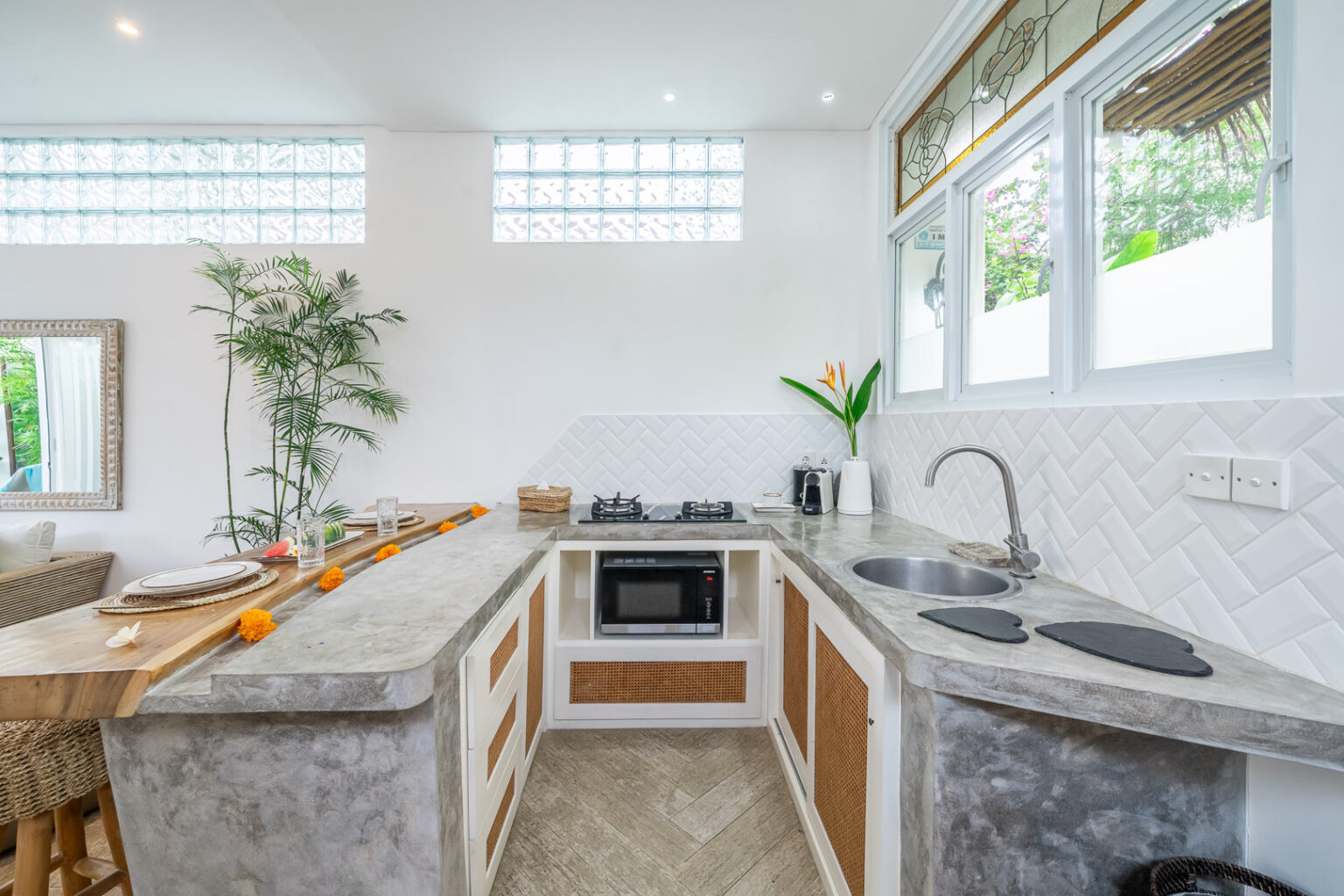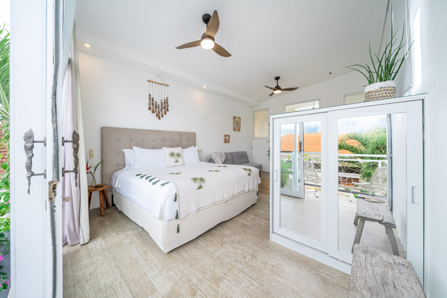 Inside, the enclosed living area is fully air-conditioned, offering a cool and cozy retreat from the Bali sun. Thoughtfully decorated with natural textures, rattan details, and calming tones, it’s the perfect space to unwind or enjoy a quiet evening in. The upstairs bedroom is bright and comfortable, opening to a small balcony with leafy views — ideal for a peaceful morning coffee or an afternoon break.